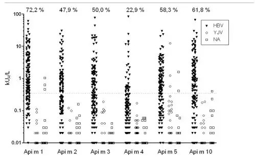 ①重组膜翅目毒液过敏原的IgE检测被认为可以提高膜翅目毒液过敏的诊断正确性。然而,对蜜蜂毒液过敏患者唯一可用的重组蜂毒(HBV)过敏原rApi m1的致敏频率是有限的,这表明可能存在另外的蜜蜂毒液过敏原。②我们对蜜蜂毒液过敏病人进行一系列蜜蜂毒液过敏原(组份)的敏感性分析。蜜蜂毒液过敏(HBV)的诊断(n = 144)是基于病史、皮肤试验结果和对HBV的过敏原特异性IgE水平。采用ImmunoCAP分析IgE对6种无交叉反应碳水化合物(CCD)的HBV过敏原的反应性。