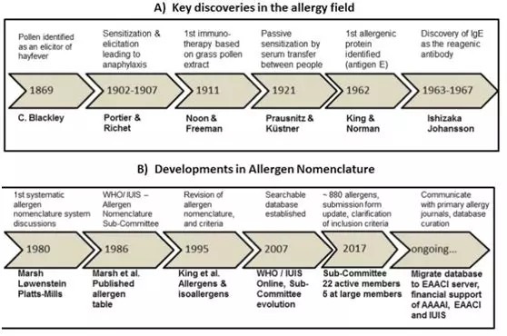 过敏原的系统命名起源于20世纪80年代早期,当时只有很少蛋白质过敏原被描述。David G. Marsh博士领导的科学家团队基于Linnaean分类法发明了一种命名法,并在1986年进一步建立了世界卫生组织/国际免疫学会联盟(WHO/IUIS)过敏原命名小组委员会。它的目的是标准化抗原(过敏原)的名称,这些抗原(过敏原)在人类中引起IgE介导的过敏。小组委员会于一九八六年首次发表修订后的过敏原名单,直至一九九四年,该名单的数量不断增加。从1994年到2007年,该数据库是一个在线文本表格,随后转变为一个更容易更新的网站。