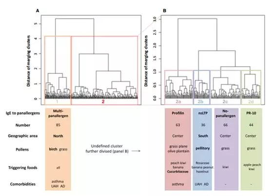 ① 花粉-食物综合征(PFS)在触发、严重程度、自然病史、并发症和对治疗的反应方面具有异质性;② 纳入1271名意大利儿童,使用ImmunoCAP FEIA测定泛过敏源Phl p 12 (profilin), Bet v 1 (PR-10), 和Pru p 3 (nsLTP)的IgE;④ 在一个以多次接触花粉为特征的地中海国家,PFS是儿童SAR复杂而频繁的并发症,具有五种不同的内型,以特异性IgE对泛变应原的敏感性为特征。