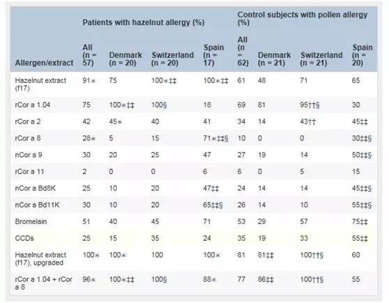 ①对榛子的食物过敏同时伴或不伴花粉过敏。②我们试图在西班牙、瑞士和丹麦三个国家中评估一组榛子过敏原,用于榛子过敏的诊断。③52例对榛子双盲、安慰剂对照食物挑战试验结果呈阳性的患者;5例有过敏反应史;花粉过敏但榛子耐受62例;63例非特应性受试者作为对照。采用ImmunoCAP法对榛子提取物、重组榛子过敏原(rCor a 1.04、rCor a 2、rCor a 8、rCor a 11)、天然过敏原(nCor a 9、nCor a Bd8K、nCor a Bd11K)的血清特异性IgE水平进行分析。