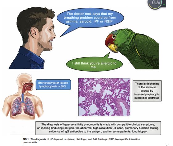 过敏性肺炎(HP)是一种TH1淋巴细胞偏向性纤维性肺泡炎,由多种抗原引起,包括禽排泄物、真菌、嗜热细菌和原生动物,以及工作场所发现的反应性化学物质。与病毒综合征相似,急性暴露于刺激抗原可导致突然出现无生产能力的咳嗽、呼吸困难、伴有关节痛的寒战或不 适,通常在4至8小时后发生,因此抗原暴露与症状之间的时间关系可能没有受到怀疑。HP组织学表现为明显的淋巴细胞浸润,使肺泡间隔增厚,伴有肉芽肿或巨细胞。几乎所有患者的支气管肺泡灌洗液中淋巴细胞都超过20%。高分辨率计算机断层检查的异常情况:从急性/亚急性疾病的结节性小叶中心混浊到晚期疾病患者典型的以上叶为主的网状斑纹和蜂窝状纤维化。描述词汇包括“镶嵌样”衰减和毛玻璃混浊。反复发作可导致结节性肺浸润和可疑的非特异性间质性肺炎或特发性肺纤维化。在广泛的肺纤维化或限制性肺疾病发生之前,临床医生需要高度怀疑才能对HP做出早期诊断。美国胸科学会的一个专家小组评论道:“对于怀疑患有间质性肺病的患者进行BAL,我们建议淋巴细胞亚群分析不是BAL细胞分析的常规组成部分。什么构成了对诊断的“高度自信”是一个有争议的问题。在没有诊断试验的情况下,诊断需符合临床症状、刺激(诱导)抗原、异常高分辨率计算机断层扫描(CT)、肺功能检测、抗原特异性IgG抗体的证据、部分患者需肺活检。