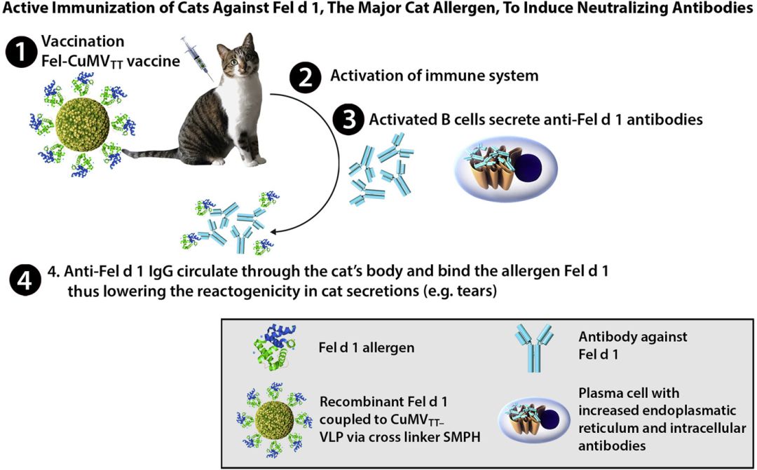 ①人类对猫的过敏通常是由猫的主要过敏原Fel d1引起的,约10%的西方人群中存在猫过敏。目前,没有治疗猫过敏的有效和安全方法。过敏患者通常的应对方法是尽量避免和猫的接触或治疗他们的过敏症状。②我们开发了一种新的策略,用自身主要过敏原Fel d1对猫进行免疫,来治疗人类受试者由Fel d1引起的过敏。③采用重组Fel d 1与来源于黄瓜花叶病毒的病毒样颗粒组成的联合疫苗对猫进行免疫【黄瓜花叶病毒含有破伤风毒素衍生的通用T细胞表位tt830-843 (CuMVTT)】。首次单独或联合使用Fel-CuMVTT疫苗进行耐受性和免疫原性研究,包括增量注射。