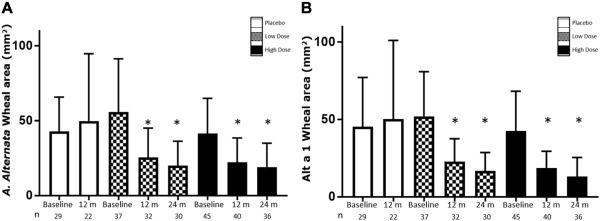 ①与用其他变应原提取物进行特异性免疫治疗相比,用真菌变应原提取物进行免疫治疗的有效性和安全性研究较少,对交链孢霉主要变应原Alt a1的研究也未见报道。②我们试图评估2种不同剂量的Alt a1皮下免疫治疗由链格孢引起的鼻结膜炎的疗效和安全性。③我们进行了一项多中心、随机、双盲、安慰剂对照试验,对年龄在12至65岁之间的过敏性鼻结膜炎合并或不合并哮喘的患者进行皮下注射Alt a1。三组包括:安慰剂组和每剂接受0.2或0.37μg Alt 1的两组治疗组治疗。主要终点为症状与用药评分的结合。次要终点为皮肤反应性、针对Alt a1的血清IgE和IgG4水平的变化。不良反应的记录按照世界过敏组织的标准进行分级。