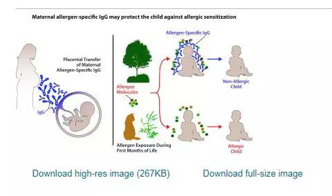 ①在出生队列中,用微阵列过敏原的方法对儿童进行过敏原特异性IgE应答分析,已经获得了儿童中特异性IgE应答演变的详细信息。需要关于过敏原特异性IgG早期进化的高分辨率数据。②分析妊娠期、脐带血样本、母乳和婴儿出生后第一年的IgG对微阵列过敏原的反应性,目的是研究母亲的过敏原特异性IgG是否可以防止子代IgE致敏。③在瑞典99个家庭的出生队列中,对母亲血浆样本、脐带血、母乳及子代不同时间点血浆分析164微阵列过敏原(ImmunoCAP ISAC technology)的IgG反应性,母亲的血浆在怀孕后期采集, ,母乳的收集在分娩后2个月, 儿童血浆样本在6、12和60个月时采集。IgE对微排列过敏原的敏感性是在儿童5岁时测定的。