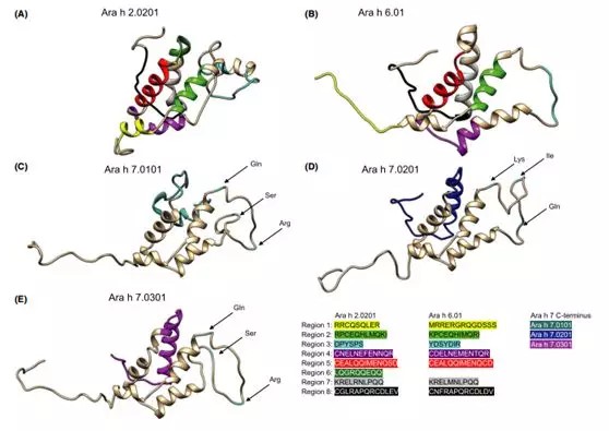 ① 2S白蛋白对花生过敏有良好的预测价值,第三个2s蛋白Ara h7鉴定出3个亚型,其变应原特性还未被阐明;② 用免疫印迹法检测15例DBPCFC确诊的花生过敏患者对重组Ara h 2.0201、Ara h 6.01及重组Ara h 7亚型的敏感性;③ 9例患者中进行嗜碱性粒细胞激活试验(BAT),以确定过敏原的IgE耦合能力;④ 病人对Ara h 7.0201的敏感性最高(80%),并且在诱导嗜碱性粒细胞脱粒方面Ara h 7.0201与Ara h 2.0201和6.01一样活跃;⑤Ara h7.0201与其它2种异构体相比,存在独特的表位。