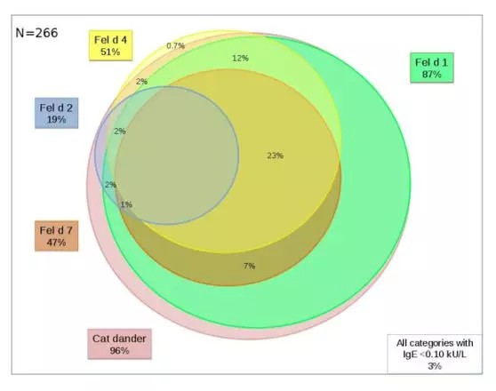 ① 猫毛敏感的分子模式因人而异,它们与哮喘患者炎症的关系还没有得到广泛的研究;② 纳入哮喘病人266人(10-35岁),其IgE对猫毛、狗毛和马毛敏感(ImmunoCAP),分析IgE对猫毛过敏原成分Fel d1(分泌球蛋白)、Fel d2(血清白蛋白)、Fel d4、Fel d7(脂蛋白)的影响;③ IgE对Fel d2的水平与FeNO (p=0.012)和总IgE (p<0.001)有相关;④IgE对于Fel d 1和猫毛提取的炎症标记物无任何关联(p = 0.23−0.51);⑤ 青年哮喘患者血清中IgE对脂蛋白(Fel d 4)和血清白蛋白(Fel d 2)的水平与2型生物标志物和总IgE含量相关。