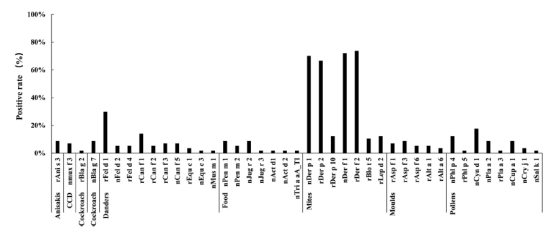 Results: With ISAC, the highest sensitization was seen for nDer f 1 (71.9%), rDer f 2 (73.7%), nDer p 1 (70.2%) and rDer p 2 (66.7%), whereas rDer p 10 and other storage mites’ components only showed 10% positivity. rFel d 1 and rCan f 1 were found positive in 29.8% and 14.0% samples respectively. Other epithelia components had less than 7.0% positive rate. Sensitization to pollen components was dominated by nCyn d 1 (17.5%) and nPhl p 4 (12.3%), Carbohydrate cross-reactive determinants (CCD) was positive in 4 patients who were also positive to nPhl p 4, nCyn d 1 and rPla a 2, and all of them have combined asthma and rhinitis. The sensitivity to mold (rAsp f 3), cockroach (nBla g 7) and Anisakis simplex component (rAni s 3) were all the same at 8.8%. 93.0% patients were sensitive to more than one component, with more than half of them (57.9%) positive to five or more components. Patients with combined asthma and rhinitis (AA+AR) were sensitive to more components than those with asthma only (AA). Positive rate to nPhl p 4 was significantly higher in patients with AA+AR than with AA only (χ2=4.31, P= 0.038).Compared with ImmunoCAP, ISAC showed a similar high detection rate for D. pteronyssinus and D. farinae, butonly 10.0% of B. tropicalis sensitive patients were positive to rBlo t 5. Optimal scale analysis on correlation of allergens components showed rDer p 10 was associated to food allergy.