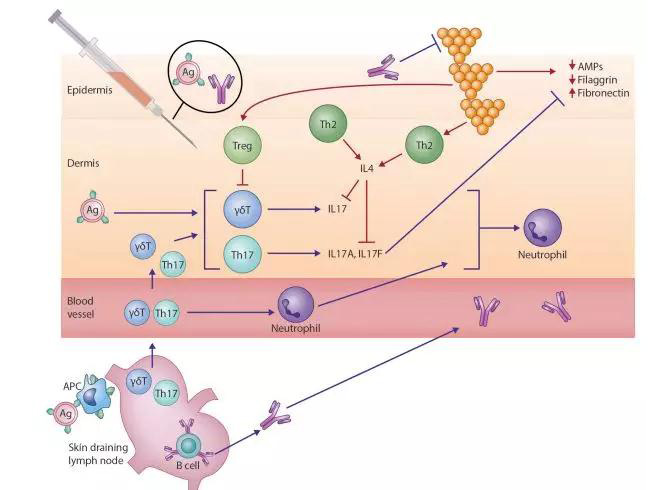 在过去的十年中,我们对AD这一复杂的异质性疾病的病因的认识有了很大的发展。“由外而内”和“由内而外”疾病过程的两分法观点已经被这样一种认识所取代,即AD的特征是受损的皮肤屏障和异常的局部和系统免疫反应的相互作用。尽管Th2偏离炎症长期以来被认为是疾病表达的中心,但TH22和TH17介导的炎症现在也在不同程度上影响不同年龄和种族的患者。金黄色葡萄球菌现在也被认为是AD患者的另一个关键致病因素,包括它在放大Th2介导反应中的关键作用。S金葡菌利用了遗传性功能缺失突变导致的聚丝蛋白表达减少,并通过TH2极化获得,以及继发于皮肤失调的抗菌肽水平降低。这些因素导致了特应性皮肤的高定植率。一旦建立,S金葡菌释放多种毒力因子,包括丝氨酸蛋白酶、外毒素和溶血素,如酚溶性调节蛋白。这些都加剧了潜在的屏障功能障碍,并使内源性促炎因子路径失调持续下去。 S金葡菌细胞壁成分,包括肽聚糖,放大TH2-驱动应答,导致增加粘附分子的表达(纤连蛋白和纤维蛋白原),减少抗菌肽的表达(人类β-防御素2和抗菌肽)和屏障蛋白(丝聚合蛋白和兜甲蛋白)。