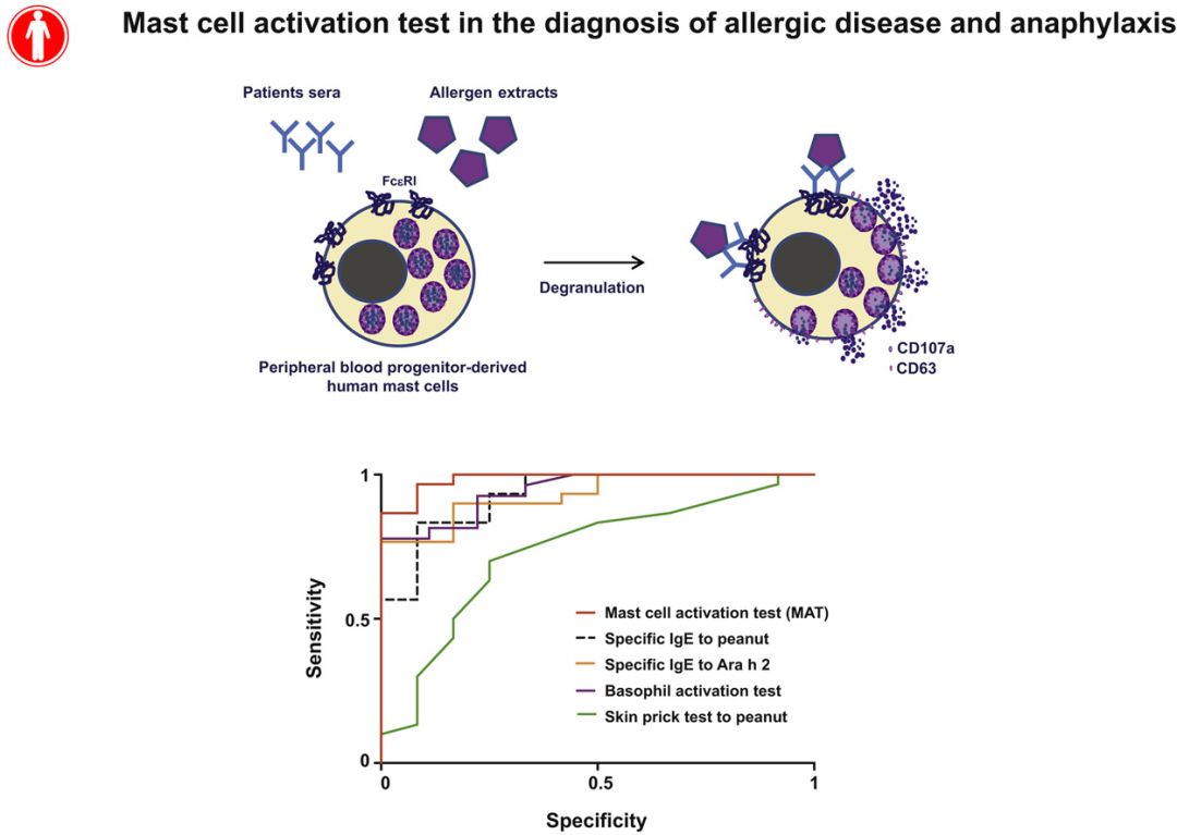 ①食物过敏是一个日益严重的公共卫生问题,也是危及生命的过敏反应的最常见原因。常规过敏试验评估过敏原特异性IgE的存在,明显高估了真实的临床过敏率,导致过度诊断和对健康相关生活质量的不良影响。②为了对一种新的诊断工具进行初步验证和评估,我们使用了肥大细胞活化测试(MAT)。③人原发性血源性肥大细胞(MCs)由外周血前体细胞产生,经患者血清敏化后与过敏原孵育。采用流式细胞术和介质释放法检测MC脱颗粒情况。我们将MATs的诊断性能与现有的诊断工具进行了比较,以评估在接受双盲安慰剂对照挑战的花生致敏受试者队列中的诊断性能。④花生、草花粉,和膜翅目昆虫(黄蜂毒)过敏病人血清致敏的人类血液肥大细胞证实有过敏原特异性和剂量依赖性脱颗粒的存在,确定是基于表面活化标记物(CD63和CD107a)的表达和功能性试验(前列腺素D2和β-氨基己糖苷酶的释放)。在这组花生致敏受试者中,MAT被发现与其他测试方法(包括组份诊断和嗜碱性细胞激活试验)相比具有更好的鉴别性能。通过功能性主成分分析,我们在结果的剂量-反应曲线中确定了5个反应簇或反应模式,这些在初步分析中与挑战时看到的反应表型相对应。⑤MAT是一个有力的工具,可以提供优于现有过敏诊断的诊断性能,并可能有助于探索在过敏反应期间嗜碱性细胞和肥大细胞之间效应细胞功能的差异。