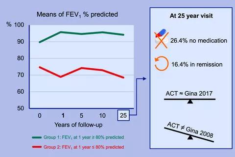 Results: There was no statistically significant change in mean FEV1% predicted (FEV1%) from baseline to the 25‐year control. The changes in FEV1% during the first year predicted the results at the end of follow‐up. Normal FEV1% at the end of the first year predicted normal FEV1, and below‐normal FEV1% at 1 year predicted below‐normal FEV 1% at 25 years. Twenty‐nine patients (26.4%) had discontinued their medication, and six (5.5%) used ICS periodically. Clinical remission was reached by 16.4% of the patients, and 7.6% reached functional remission. The general HRQoL remained unchanged.