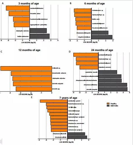 方法:对3、6、12、24个月和7岁过敏儿童(n=47)以及7岁以下健康儿童(n=33)的唾液样本中口腔细菌组成成分特征采用16S rDNA基因的Illumina测序法测序。