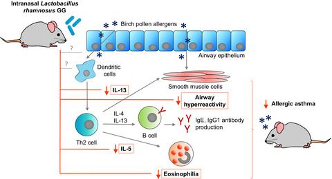 Results: Transient colonization of the murine upper airways by L. rhamnosus GG was demonstrated and was approximately ten times higher compared to L. rhamnosus GR-1.Marked binding of fluorescent L. rhamnosus GG to murine nasal mucosal cells and airway macrophages was visualized. Preventive treatment with L. rhamnosus GG (but not L.rhamnosus GR-1) resulted in a significant decrease in bronchoalveolar lavage eosinophil counts, lung interleukin-13 and interleukin-5 levels, and airway hyperreactivity. A tendency towards a decrease in serum Bet v 1-specific IgG1was likewise observed.