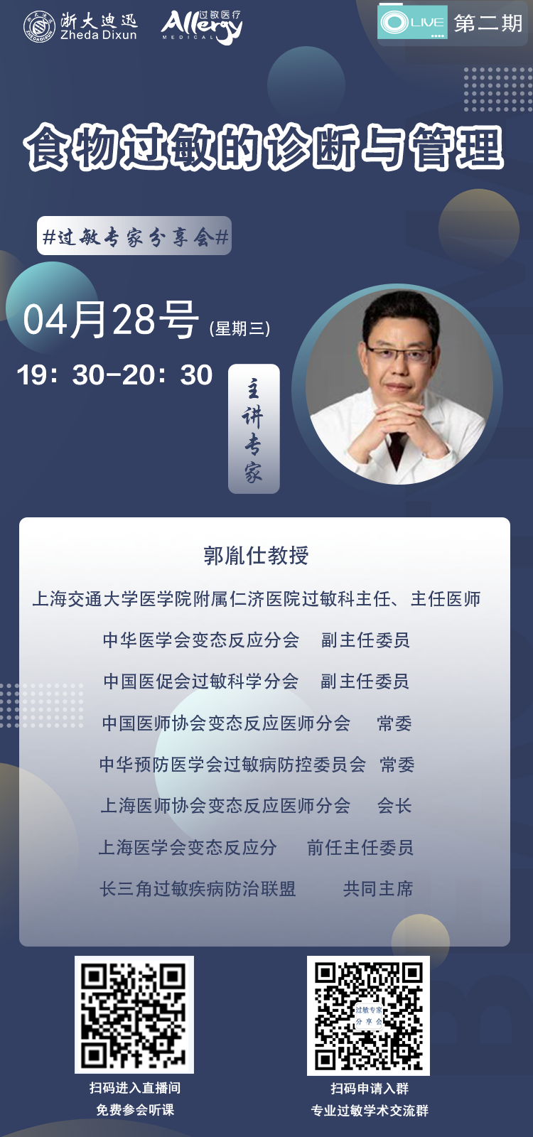 欢迎大家4月28日晚上19:30收看“食物过敏的诊断与管理”直播讲座