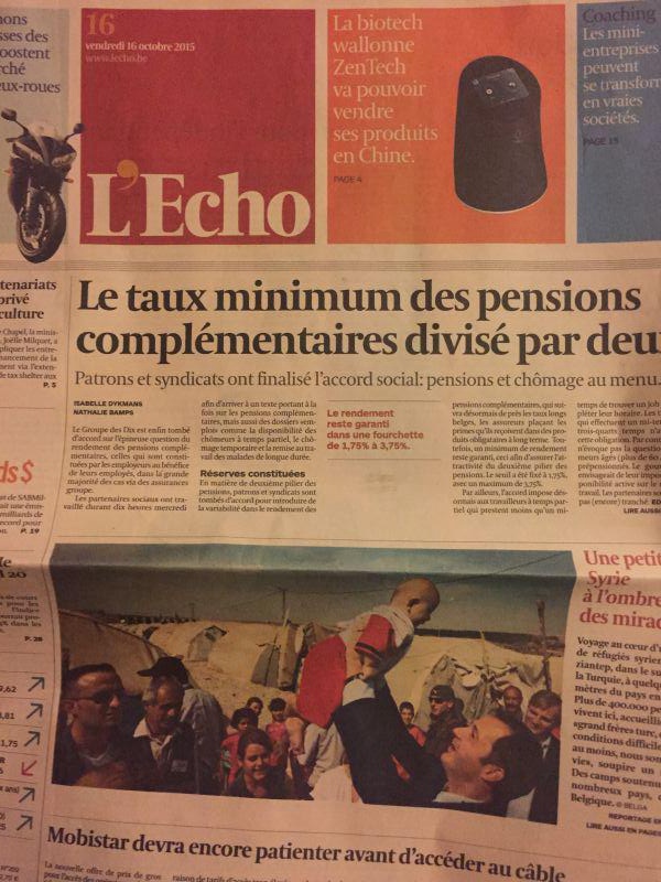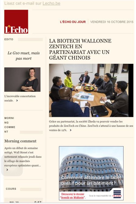 2015年10月15日在欧洲最大的经济报L'Echo(回声报)头版头条进行新闻