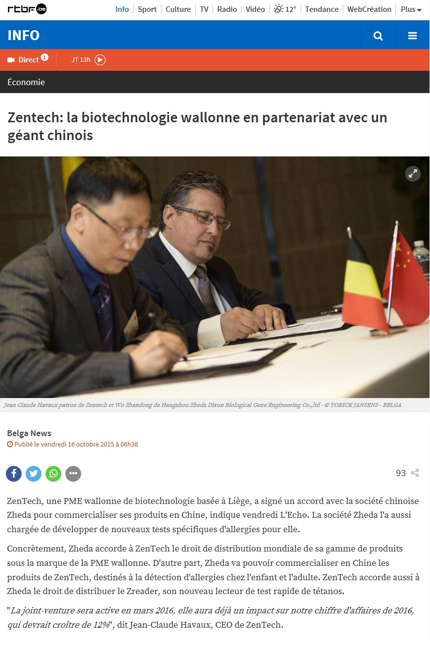 2015年10月16日比利时国家广电(电视、广播)公司报道了浙大迪迅与比利时Zentech S.A.合作